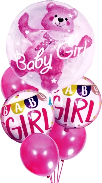 1× balon z medvedkom in napisom »Baby Girl«, 2× balon z girlando in napisom »Baby Girl«, 3× rožnati baloni brez potiska