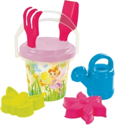 - Popolna oprema: kanglica 1,3 l, grabljice, lopatka, sito, zalivalka in 2 tematska modelčka