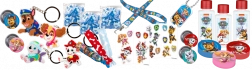 3 naglavni trakovi, 1 obesek za ključe, 4 priponke, 4 značke, 4 pasje tablice, 1 mleko za telo, 1 gel za prhanje, 2 kompleta nalepk, 3 paketki konfeta, 3 šumeče kroglice