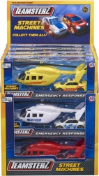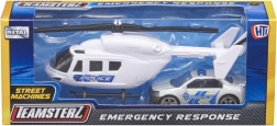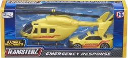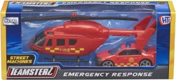 Komplet TEAMSTERZ združuje zabavo in vzdržljivost: podrobno izdelan helikopter z ročno vrtljivimi rotorji ter akcijsko intervencijsko vozilo s prosto vrtečimi se kolesi. Zahvaljujoč kovinskemu (tlakovno litemu) ogrodju in kakovostnim plastičnim delom bodo otroci uživali v realistični igri na policijo, gasilce in reševalce.
