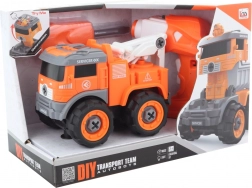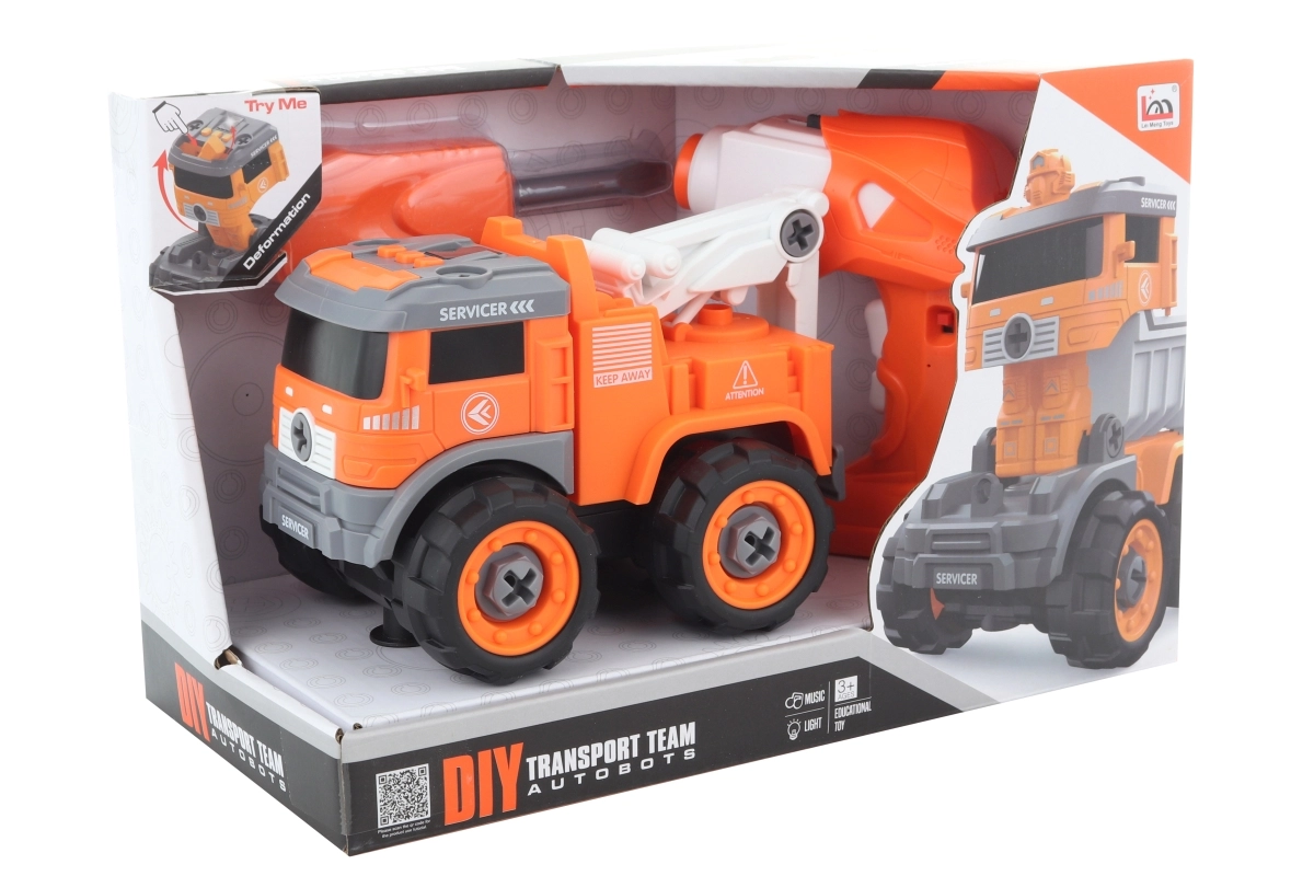Zabavna sestavljanka in RC igrača v enem! Ta vijačna vlečna služba se z priloženim izvijačem ali vrtalnikom zlahka razstavi in ponovno sestavi, poleg tega jo lahko preoblikujete v robota. Odstranljiv motorček iz vrtalnika vstavite v avto in ta nato vozi na daljinsko upravljanje naprej in nazaj. Igrača sveti in oddaja zvoke, spodbuja fino motoriko in ustvarjalnost otrok. Idealno za otroke od 3 let dalje.