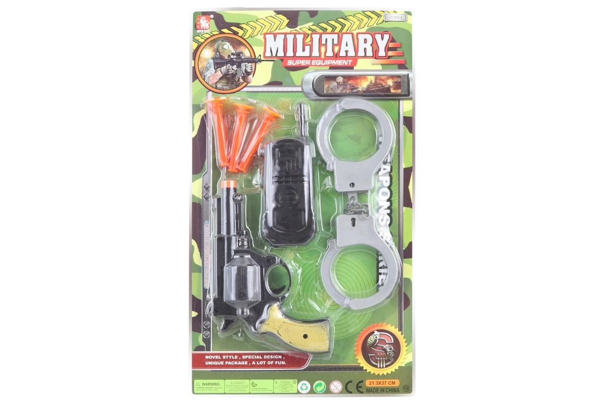 Zabaven vojaški komplet za male avanturiste z realističnimi dodatki za akcijsko igro. Vsebuje revolver, tri naboje s priseskom, voki-toki in lisice. Idealno za otroke od 3 let.
