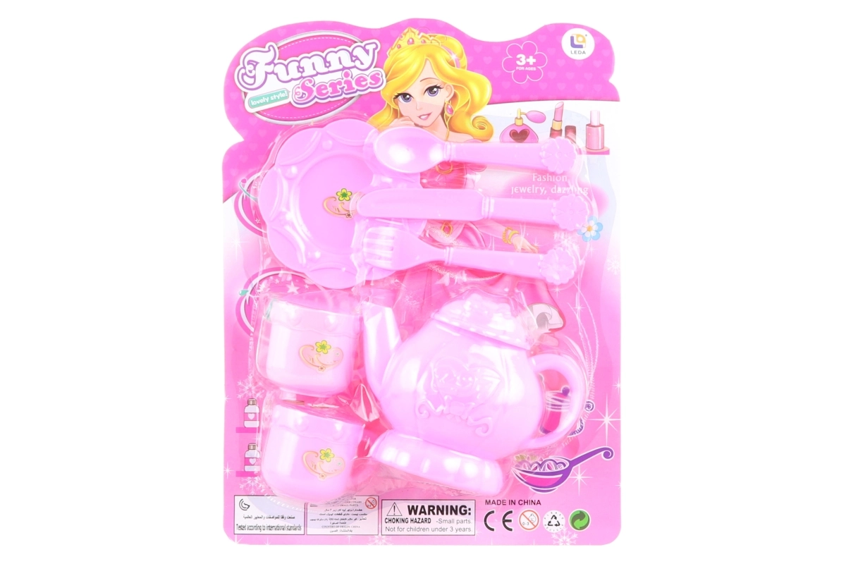 Zabaven otroški set posod za male kuharje in kuharice prinaša vse potrebno za igre doma. Vsebuje 2 skodelici, krožniček, vrč in pribor. Idealno za razvoj domišljije, fine motorike in socialnih veščin. Priporočeno od 3 let.