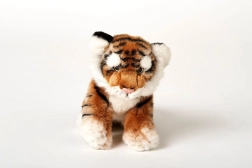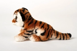 Plišasti rjav tiger velikosti približno 25 × 19 × 11 cm (brez repa). Dolžina repa približno 12 cm. Starost 0+