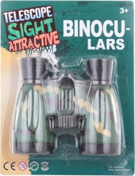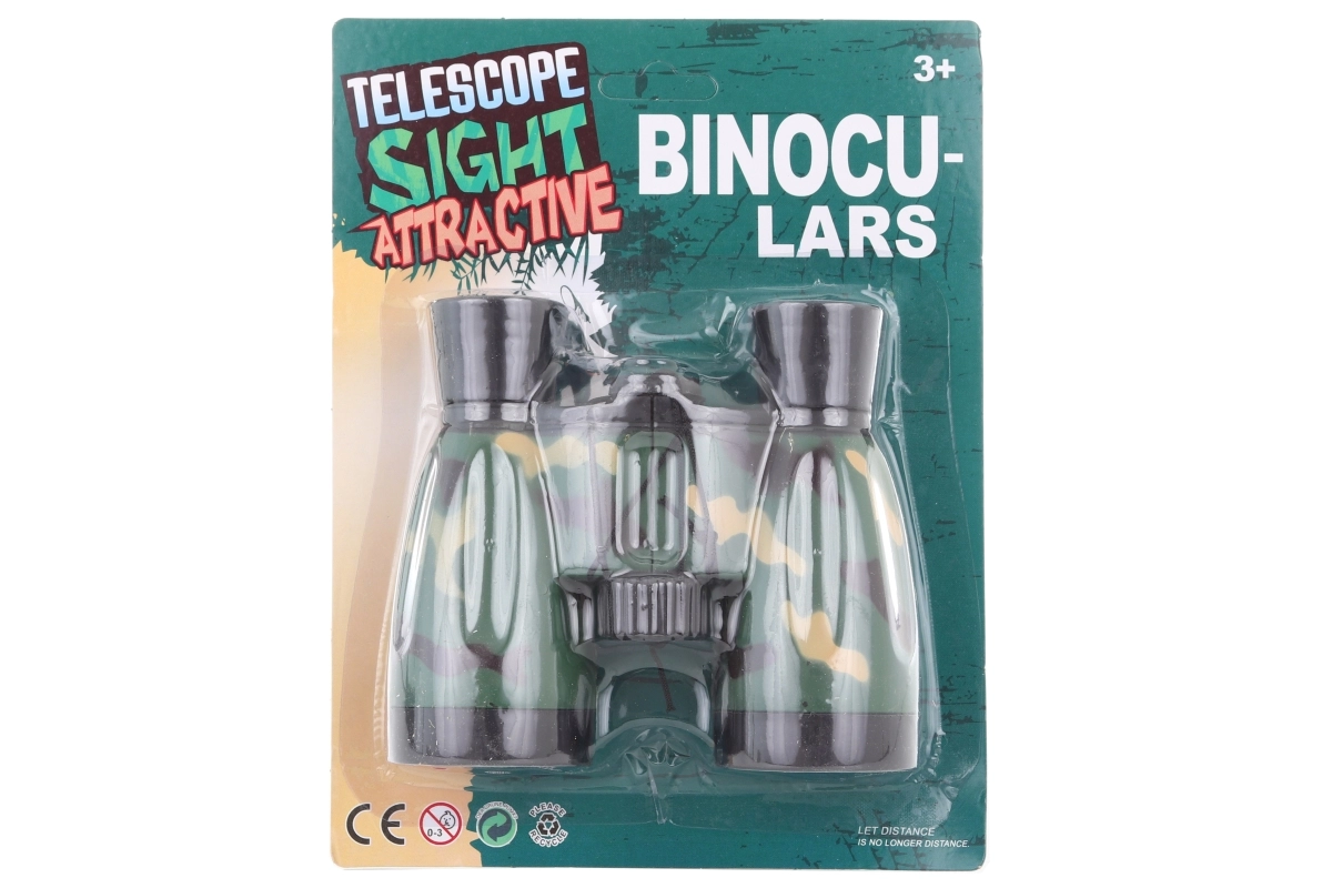Plastični daljnogled v maskirnem vzorcu, velikosti približno 13,5 × 12 × 5 cm. Dimenzije embalaže približno 17 × 22 × 5,5 cm. Starost 3+.