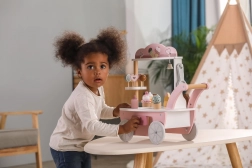 • Otrokom prijazen dizajn: nežne pastelne barve, privlačni detajli, zvonček in kolesca.