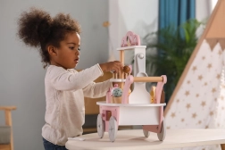 Stojnica nudi veliko shranjevalnega prostora, vključno z odpirajočo se poličko, kamor lahko pospravite dodatke. Vse je premazano z netoksičnimi barvami in izdelano iz trpežnega lesa za dolgo življenjsko dobo. Idealno za samostojno igro ali skupno igranje s sorojenci in prijatelji – razvija fino motoriko, logično razmišljanje in družbene veščine.