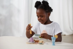 Zaradi robustnega lesa in kakovostne izdelave je set vzdržljiv pri vsakodnevni igri. Primeren za otroško kuhinjico, igralni kotiček ali na pot. Igra s hrano podpira učenje barv, oblik in osnovnih pravil pri mizi.