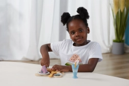 Barvni koščki hrane, sladica in pijača otrokom omogočajo, da postrežejo kosilo kot zares in vadijo osnove bontona pri mizi.