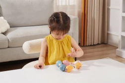 Ergonomska oblika se prilega majhnim otroškim ročicam, podpira koordinacijo roka–oko ter prve poskuse tresenja in kotaljenja.