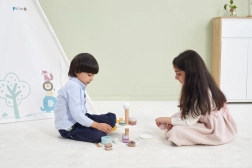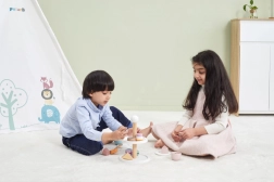 Igra čajnega popoldneva razvija komunikacijo, domišljijo in sodelovanje med otroki. Barvite tortice spodbujajo razvrščanje in štetje, skodelice in žličke pa podpirajo koordinacijo oko–roka in fino motoriko. Eleganten dizajn v nežnih barvah se lepo poda v vsak otroški sobici.