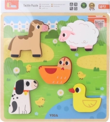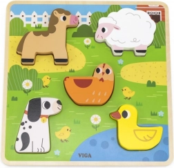 Odkrijte zabavne lesene vstavljanke s motivom kmetije znamke VIGA. Barvna plošča in pet masivnih živalskih koščkov pomagata razvijati fino motoriko, koordinacijo oko–roka in logično razmišljanje. Idealna igrača za najmlajše od 18 mesecev – varna, trpežna in enostavna za prijem malih rokic.