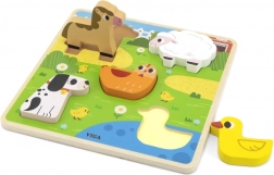 Ta ljubka lesena sestavljanka na temo kmetije vsebuje 5 robustnih koščkov – konjička, ovčko, kokoško, kužka in račko. Otroci vstavljajo živalice v ustrezne odprtine na barvni podlagi ter s tem urijo prepoznavanje oblik in vizualni spomin.