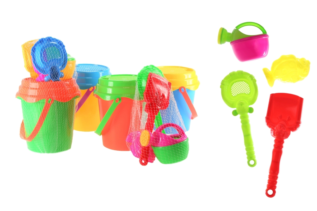 - Vedro (višina 19 cm), sito, kanglec, lopatka, lopatka s sitom, modelček