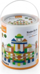 Lesena sestavljanka v vedru. Vsebuje 100 delov in slikovni priročnik z navodili za sestavljanje. Dimenzije pakiranja približno 18 × 21 cm. Velikost kock 2,5–7,5 cm glede na vrsto. Starost 2+