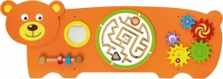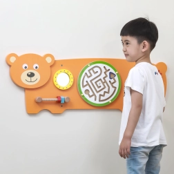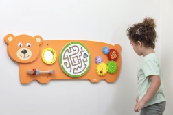 Senzorična tabla Medvedek je zasnovana po načelih Montessori, da otroke naravno motivira k raziskovanju in urjenju veščin. Ponuja več vrst aktivnosti: vrtenje zobnikov, vodenje kroglice v labirintu, opazovanje v varnem ogledalcu in vadbo prijema z vijaki na navoju. Zaradi robustne lesene konstrukcije in možnosti stenske namestitve je odlična za otroške sobe, igralnice in vrtce.