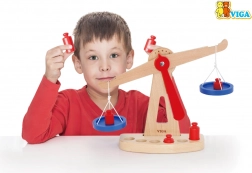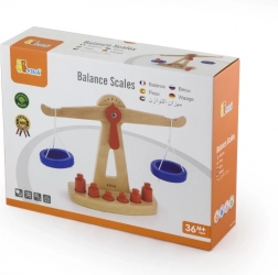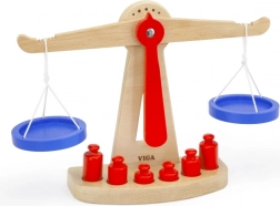 Lesena ravnotežnostna tehtnica znamke Viga je opremljena z dvema modrima skledama obešenima na vrvicah in vključuje šest rdečih uteži različnih velikosti. Zaradi svoje barvite zasnove in varnega površinskega premaza ta tehtnica otrokom prinaša veliko zabave. Tehtnica je zasnovana tako, da motivira otroke k uporabi svoje domišljije in kreativnosti pri igri trgovine, kar jim pomaga razumeti osnovne matematične koncepte in vrednost ravnotežja.