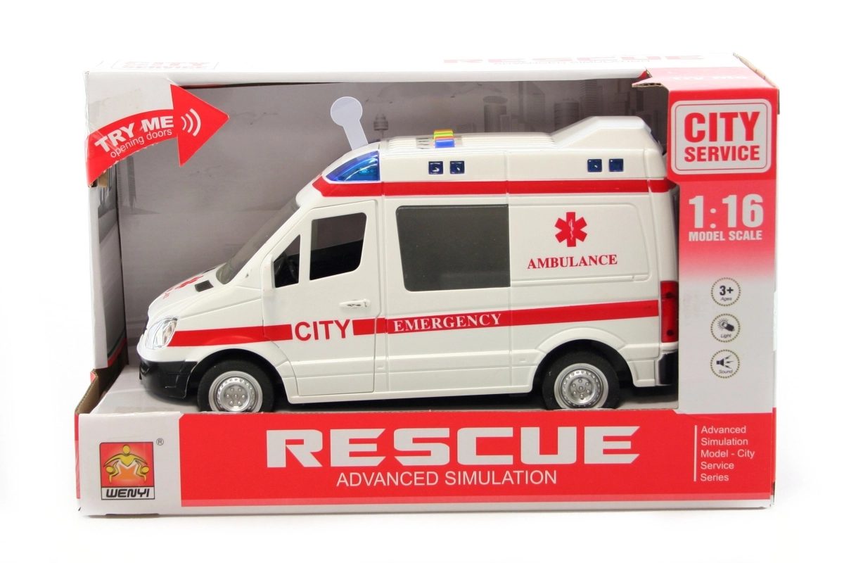 Realistični plastični reševalni avtomobil na baterije bo razveselil vsakega malega reševalca. Po pritisku na gumbe na strehi sveti in oddaja zvoke, ima odpirajoča se vrata in kompaktne dimenzije, idealne za otroške roke.