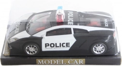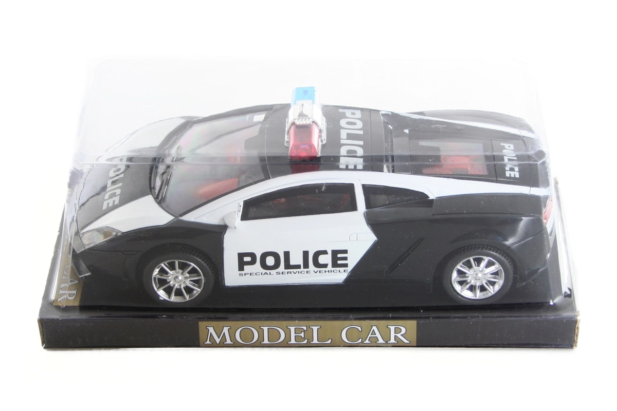 Policijski avto na vztrajnik. Dimenzije avta približno 22 × 9 × 7 cm. Dimenzije pakiranja približno 26 × 13 × 10 cm. Starost 3+