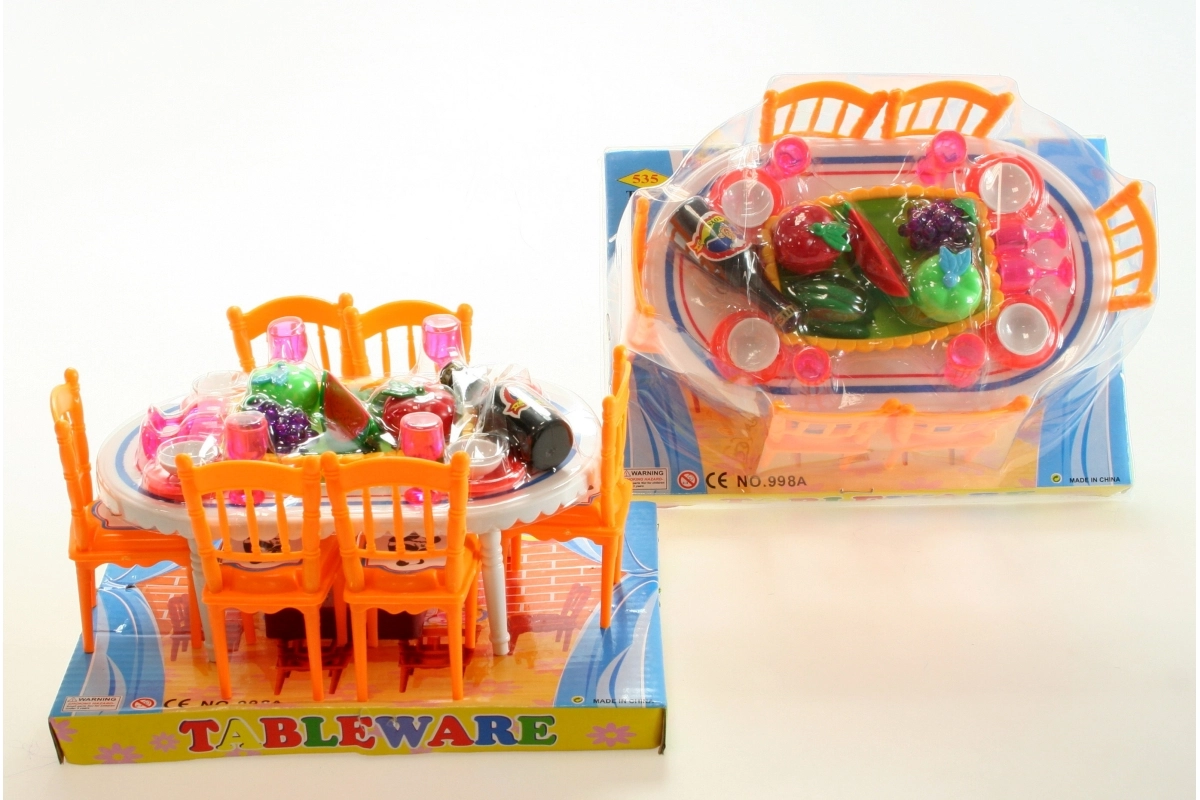 - Celovit set: mizica, 6 stolčkov, posodica in hrana.