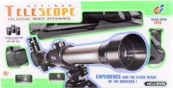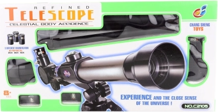Plastični teleskop s stojalom. Premer objektiva 60 mm, fokusna razdalja 170 mm, povečava 20x, 30x in 40x. Dimenzije embalaže približno 43 x 22 x 8 cm. Starost 8+