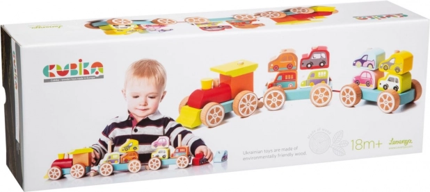 Ta barvna lesena sestavljanka vsebuje 14 delov, iz katerih lahko otroci sestavijo vlak z dvema vagonoma in osmimi avtomobilčki. Igrajo se ne le z posameznimi deli, temveč tudi razvijajo svoje senzomotorične sposobnosti, logično razmišljanje in kreativnost.