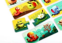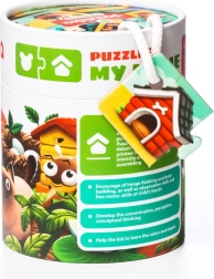 Zabaven set Puzzlika Moj dom uči otroke povezovati živali z njihovimi domovi. Vsebuje 20 velikih trdnih kosov, ki tvorijo 10 parov. Podpira logično razmišljanje, razvoj fine motorike, spoznavanje živali in okolja ter vizualno zaznavanje. Izdelano iz vzdržljivega večplastnega kartona z bleščečo površino, enostavno za čiščenje in idealno za predšolske otroke.