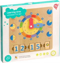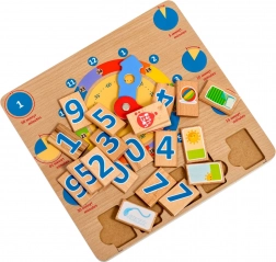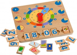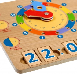Del kompleta je 14 številčnih blokov in 6 slikovnih blokov dnevnih aktivnosti. Štiri časovne bloke je mogoče vstaviti v pripravljene reže za ustvarjanje digitalnega časa, medtem ko peti blok predstavlja ustrezno dejavnost. Otroci tako vizualno povežejo analogno uro z digitalnim zapisom in vsakdanjim dnevnim ritmom.