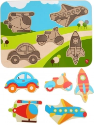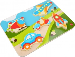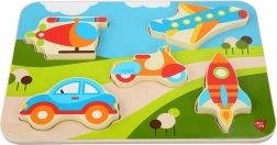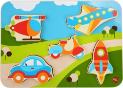 Ta kakovostna lesena vstavljanka s temo prevoznih sredstev navduši z živimi barvami in jasnimi oblikami, ki jih otroci zlahka primejo in položijo na pravo mesto. Nekateri koščki zaradi svoje debeline celo samostojno stojijo, zato se lahko otroci z njimi igrajo tudi izven podlage.