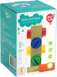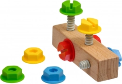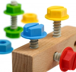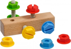 Igrača je idealna za predšolske otroke in podpira naravno učenje skozi igro. Zahvaljujoč intenzivnim barvam si otroci zlahka urijo barvno ujemanje in razvrščanje, medtem ko vijakanje v leseni blok razvija tehnično razmišljanje in potrpežljivost.