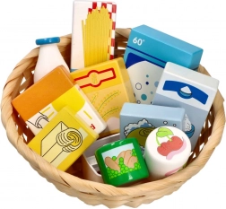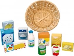 Lesena nakupovalna košara s živili za otroke