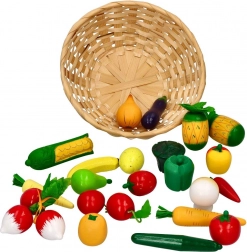 Komplet vključuje pester izbor sadja in zelenjave z živahnimi barvami, ki spodbujajo vizualno zaznavo in učenje poimenovanja živil.