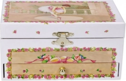 Ta očarljiva škatlica v slogu glasbene skrinjice izstopa z nežnim dizajnom in čarobnim presenečenjem v notranjosti. Po odprtju pokrova se sproži klasična melodija Labodje jezero in mala balerina se začne vrteti pred ogledalcem. Zahvaljujoč predalu in razdeljenemu prostoru boste zlahka shranili prstane, zapestnice in druge zaklade.