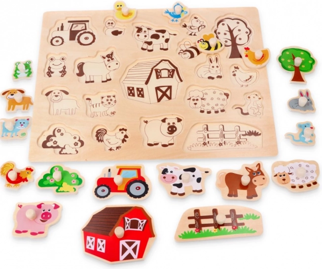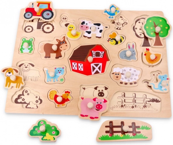 Vstavljanka je odlična za širjenje besedišča in vizualno prepoznavanje – otroci se učijo poimenovati živali, traktor in skedenj. Velik format 40 × 30 cm zagotavlja preglednost in stabilnost pri igri.