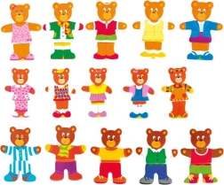 Oblecite medvedke glede na razpoloženje in priložnost ter se pri tem učite kombinirati oblike in barve. Otroci zlahka menjajo glavice, telesca in nogice, urijo pozornost in ustvarjajo vesele zgodbe. Praktična lesena škatla ohrani vse kose skupaj, njen pokrov pa služi kot stabilna podlaga za sestavljanje.