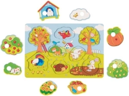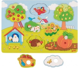 Goki lesena vstavljanka Na vrtu je barvita igrača, ki je idealna za razvoj motoričnih in kognitivnih sposobnosti otrok. Ima osem barvnih kosov s podlago slike, ki se odlično prilegajo na svojo leseno podlago.