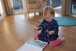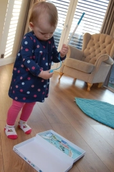 Otrok pri igri uporablja leseno palico z magnetom, kar pripomore k razvoju koordinacije oči-roka in fine motorike.