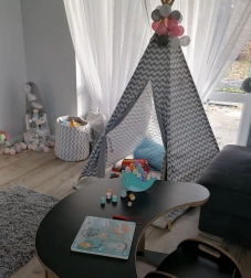 Trdni leseni delci z gladkimi robovi, certifikat CE in nežna barvna paleta zagotavljajo varno in estetsko igro, ki prenese vsakodnevno uporabo.