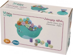 Odkrijte zabavno leseno ravnotežno igro z narvalom, v kateri otroci uravnotežajo pisané valjčke z motivi morskih živalic na gugalni osnovi. Cilj je ohraniti ravnotežje in zlagati delčke tako, da se narval ne prevrne – odlična vadbena igra za fino motoriko, koordinacijo oči in rok ter potrpežljivost.