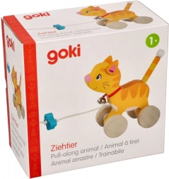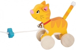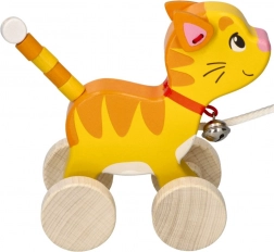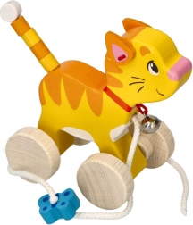Ta simpatična lesena vlečna mačka je idealna igrača za podporo motoričnega razvoja in ravnotežja pri malih otrocih. Opremljena je z zvončkom, ki pri premikanju nežno zvoni, kar igračo naredi še privlačnejšo.