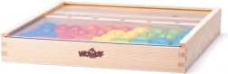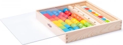 Kreativen in izobraževalen komplet, ki združuje učenje in zabavo. Otroci nizajo barvne perlice na palice po predlogah in tako razvijajo vizualni spomin, logično mišljenje, matematične spretnosti ter fino motoriko. Vse je shranjeno v trpežnem lesenem zaboju, ki služi tudi kot podstavek za igro.