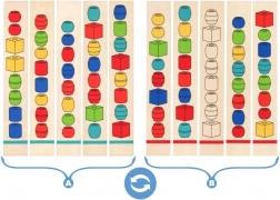 Obojestranske kartice z vzorci otroka vodijo korak za korakom. Uri se pozornost, spomin in logično razvrščanje elementov.