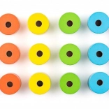 Velike lesene kroglice z odprtino za lahko prepletanje so odlična učna pripomoček za dom in vrtec. Zaradi izrazitih barv in prijetnega materiala otroci radi vadijo razvrščanje, zlaganje in nizanje ter tako na nevsiljiv način krepijo veščine, potrebne za pisanje in koncentracijo.