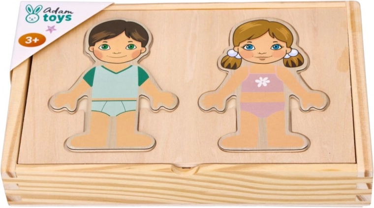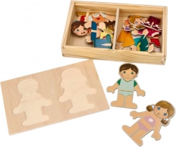 - Figuri dečka in deklice z izmenljivimi magnetnimi deli oblačil, lesena škatlica/podlaga