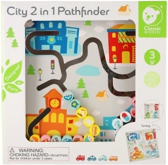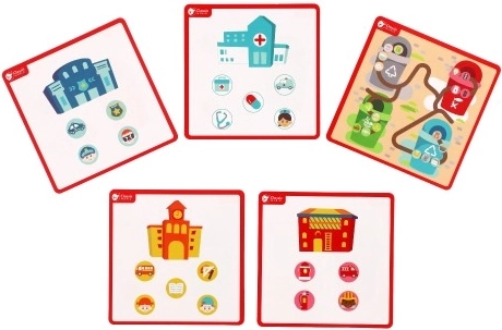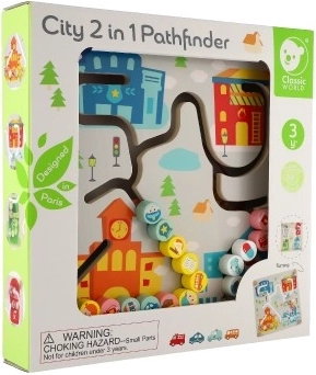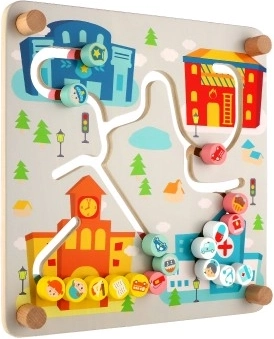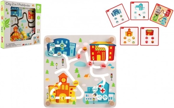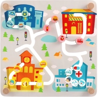 Ta kakovosten leseni labirint ponuja dve izobraževalni sceni v enem. Na mestni strani otroci vodijo vozila in like po izrezkanih poteh do bolnišnice, gasilcev ali policije ter pri tem urijo prostorsko orientacijo, načrtovanje in potrpežljivost. Barvita grafika in jasno označene poti spodbujajo samostojno igro in sodelovanje s starši.