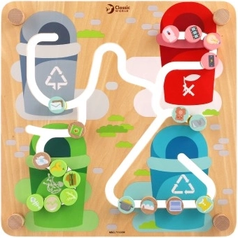 Drugo stran predstavlja tema recikliranja, kjer si otroci na igriv način osvojijo osnove ločevanja odpadkov in predmete dodelijo pravilnim zabojnikom. Zahvaljujoč dvostranski plošči naravno nastaja dialog o varovanju narave in delovanju mesta. Trdna lesena izvedba (30 × 30 cm) ter gladki, zaobljeni robovi zagotavljajo varnost in dolgo življenjsko dobo.