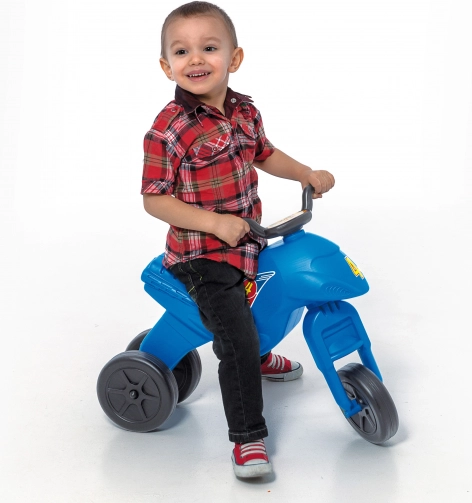 Stabilen trikolesni poganjalec Super Bike v modri barvi. Mere 60×28×48 cm, nosilnost 50 kg. Idealen za prve vožnje doma in na prostem.