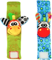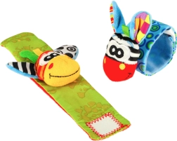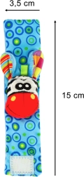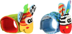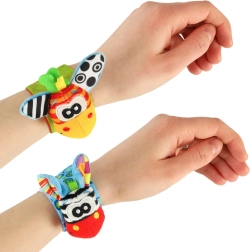 Prisrčni trakovi z živalicami pritegnejo dojenčka s kontrastnimi barvami in vzorci, mehkim blagom in različnimi teksturami za tip. Vsak gib ročice nagradi nežen zvok ropotuljice, ušeska pa skrivajo tudi šumečo folijo za dodatne senzorične vtise.