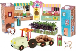 Predstavljamo vam Lena ustvarjalni komplet Eco vasica, ki spodbuja otroško ustvarjalnost in domišljijo. Ustvarite svojo majhno vas, polno stojnic, zeliščnih vrtičkov in celo traktorja. Del pakiranja je knjižica zgodb in podrobna navodila. Glavne lastnosti: