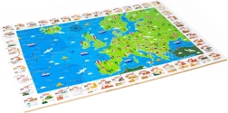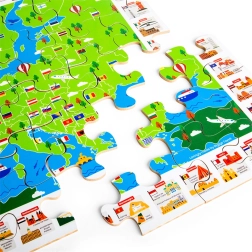 Barvit zemljevid Evrope z zastavami in ikoničnimi znamenitostmi motivira otroke k odkrivanju držav in njihove lege. Sestavljanje razvija logiko, orientacijo in besedni zaklad.